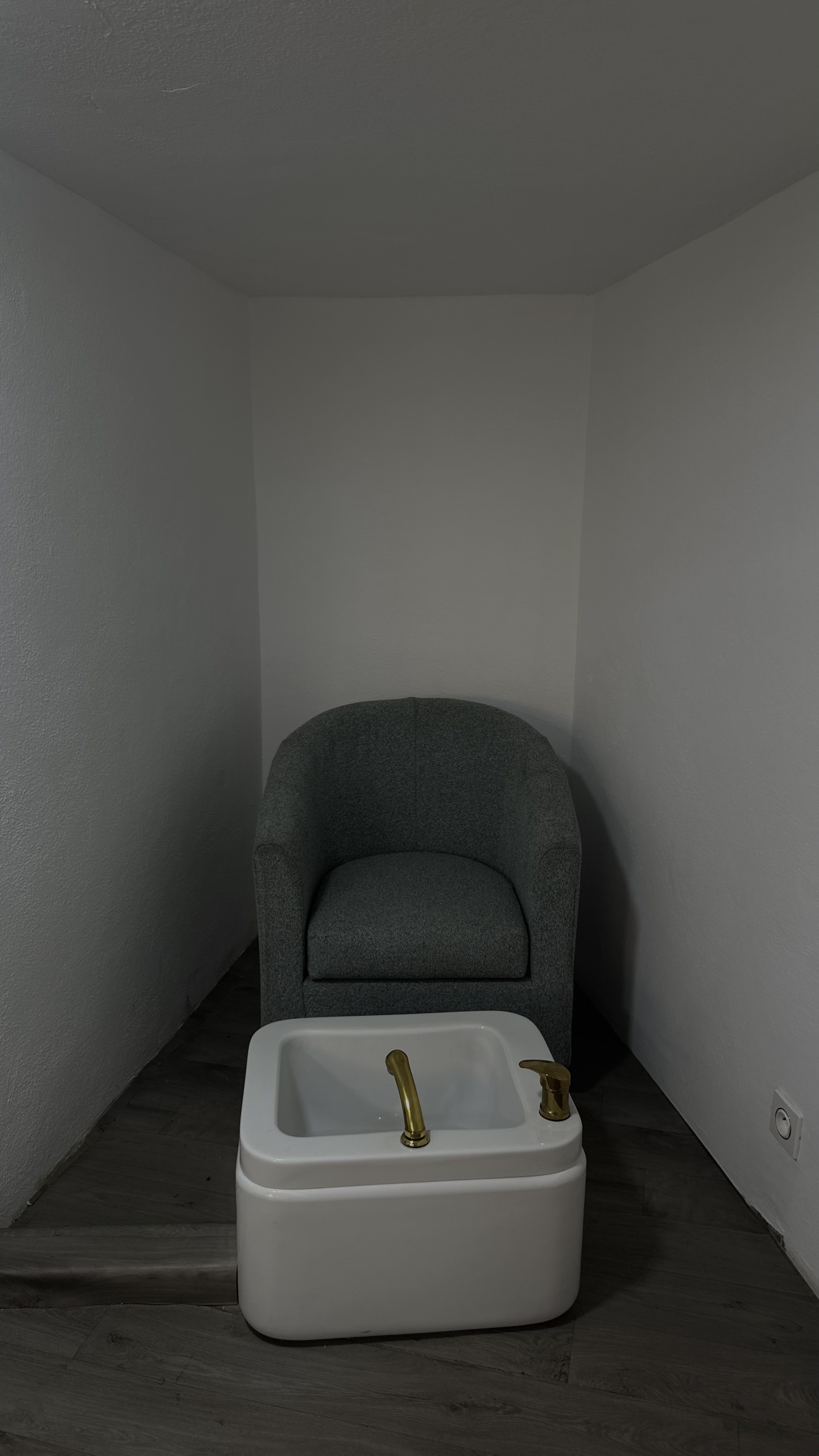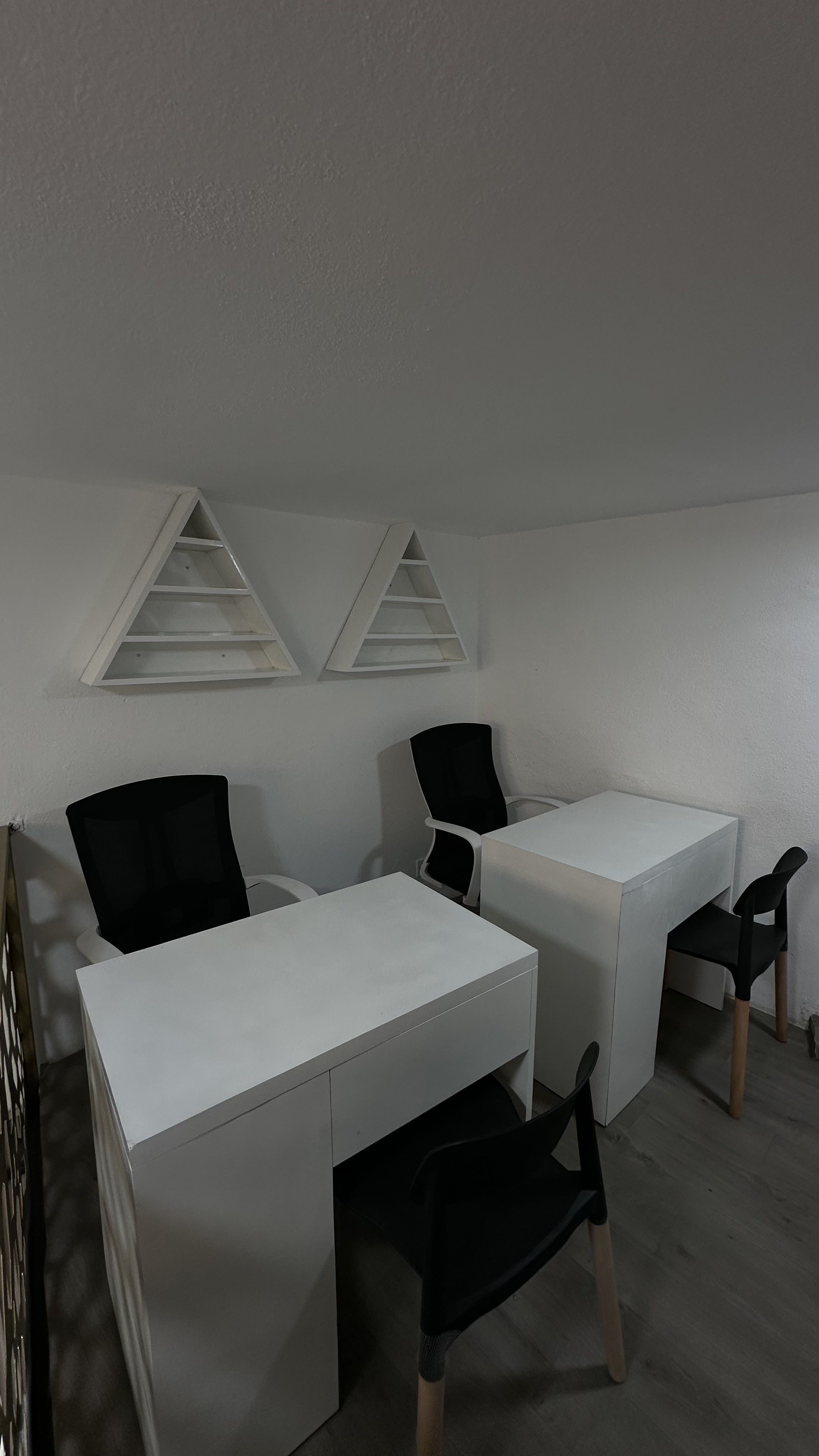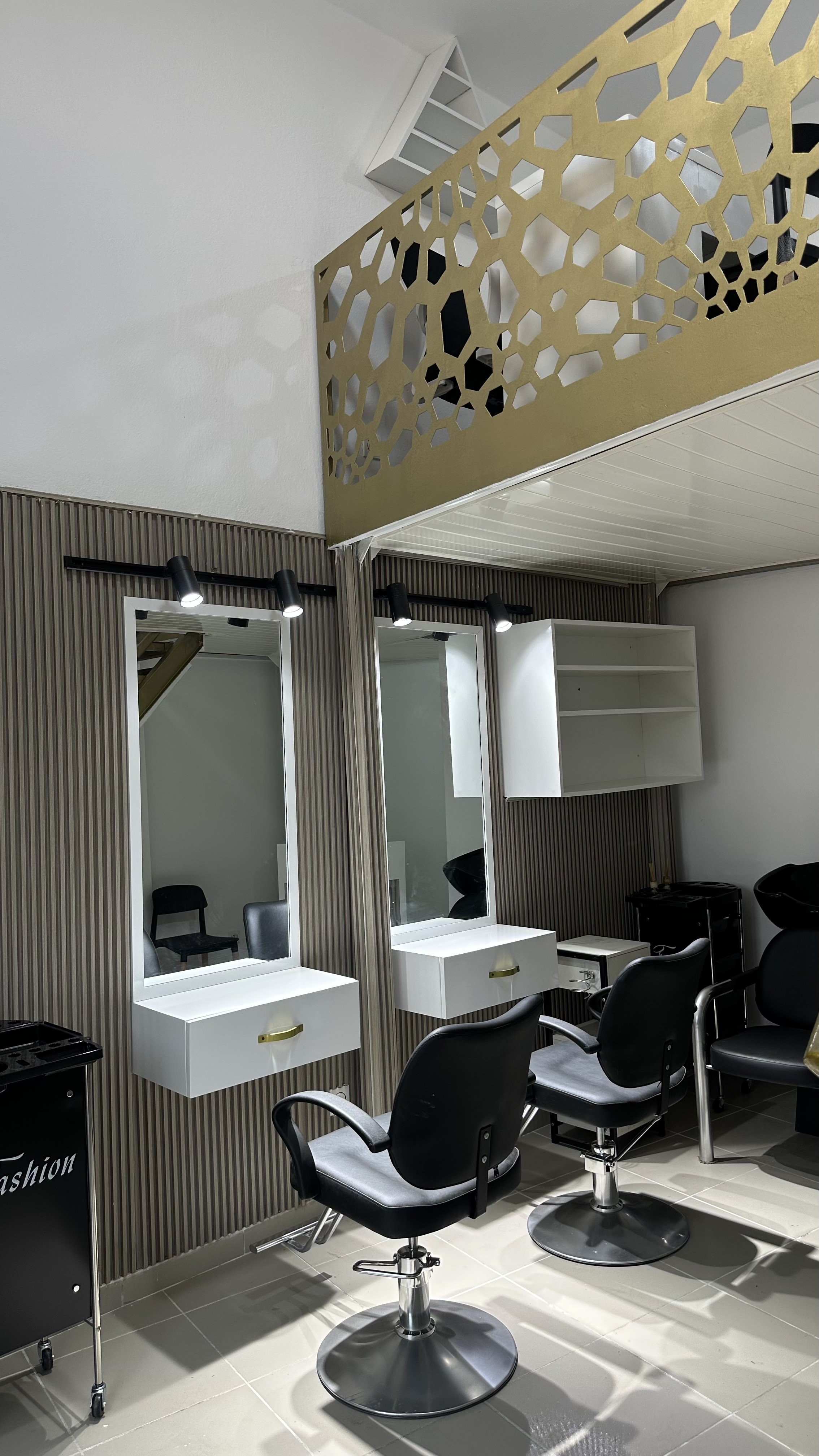 Transformation d’un local en salon de beauté avec électricité, faux plafond, ferronnerie, peinture, mobilier, matériel professionnel et décoration.
