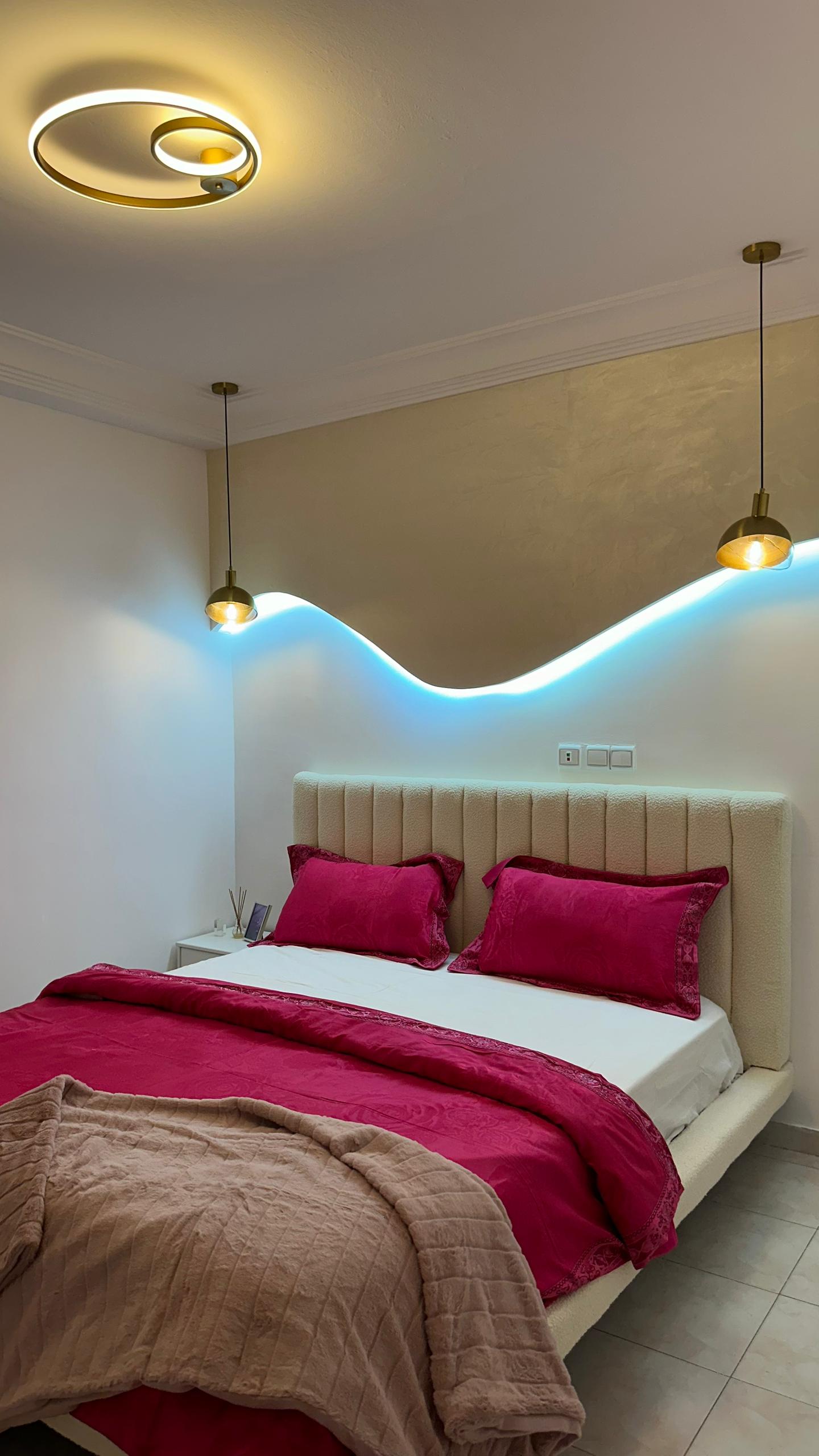 Pose de placo mural, peinture décorative, plan d’éclairage repensé, ajout de luminaires, remplacement des anciens placards par du mélaminé moderne.