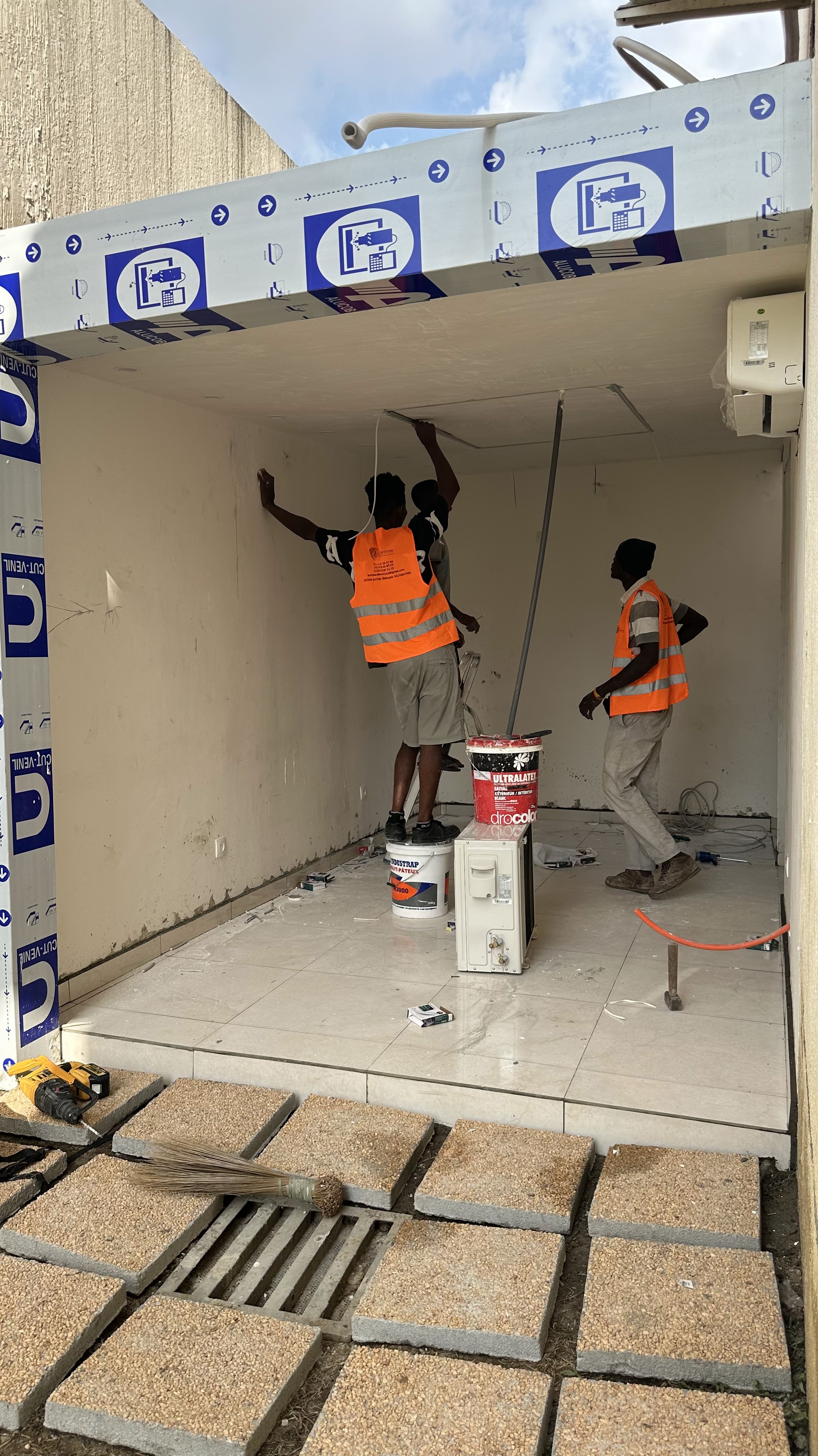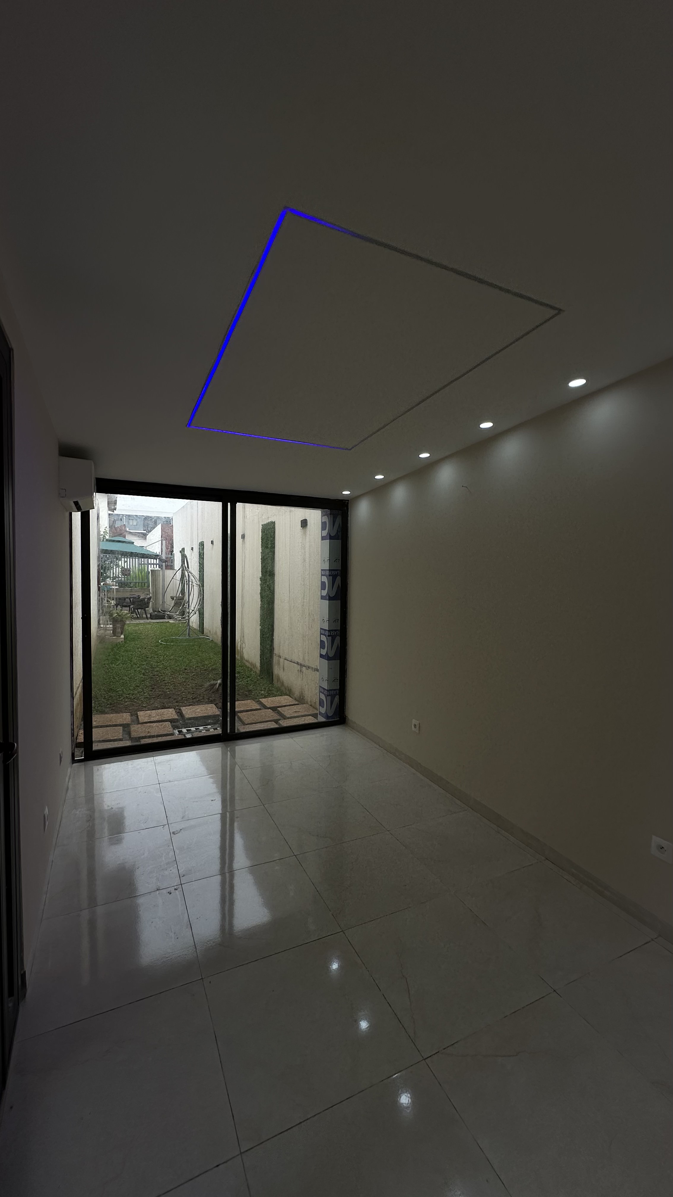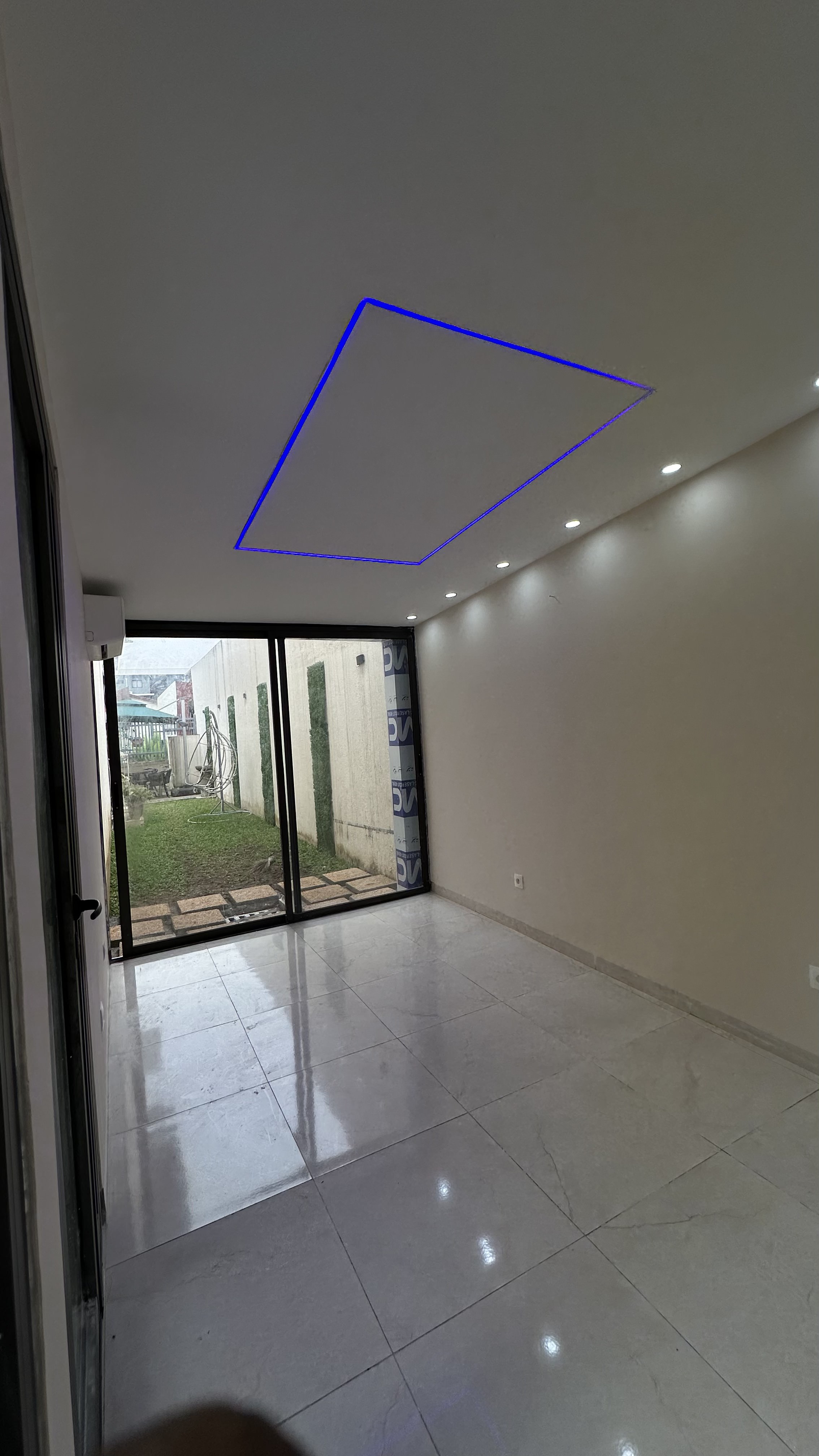 Conversion d’une salle de sport en salon privé avec cloisonnement, baie vitrée, faux plafond en placoplâtre, remplacement du carrelage, électricité et peinture complète.