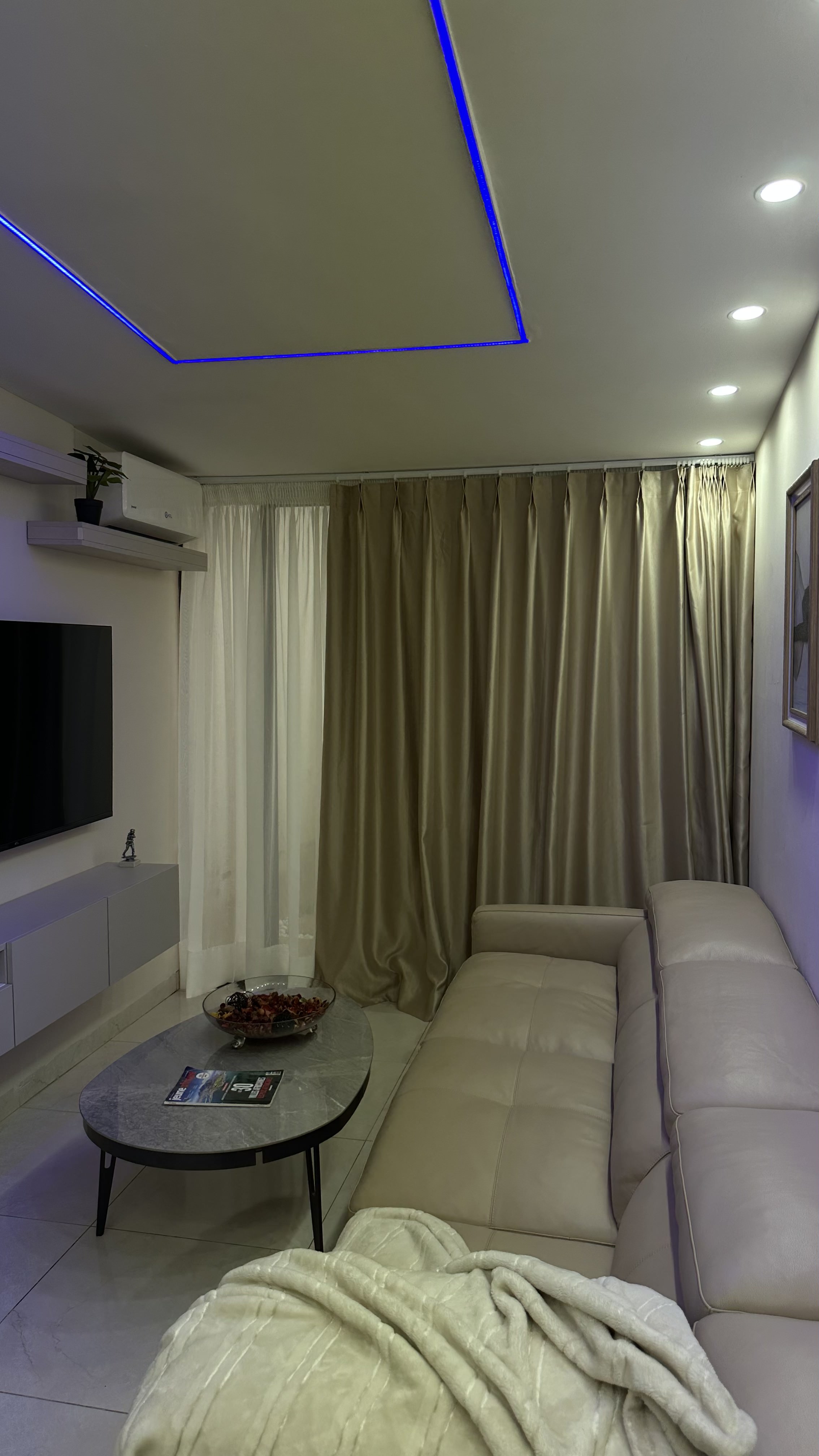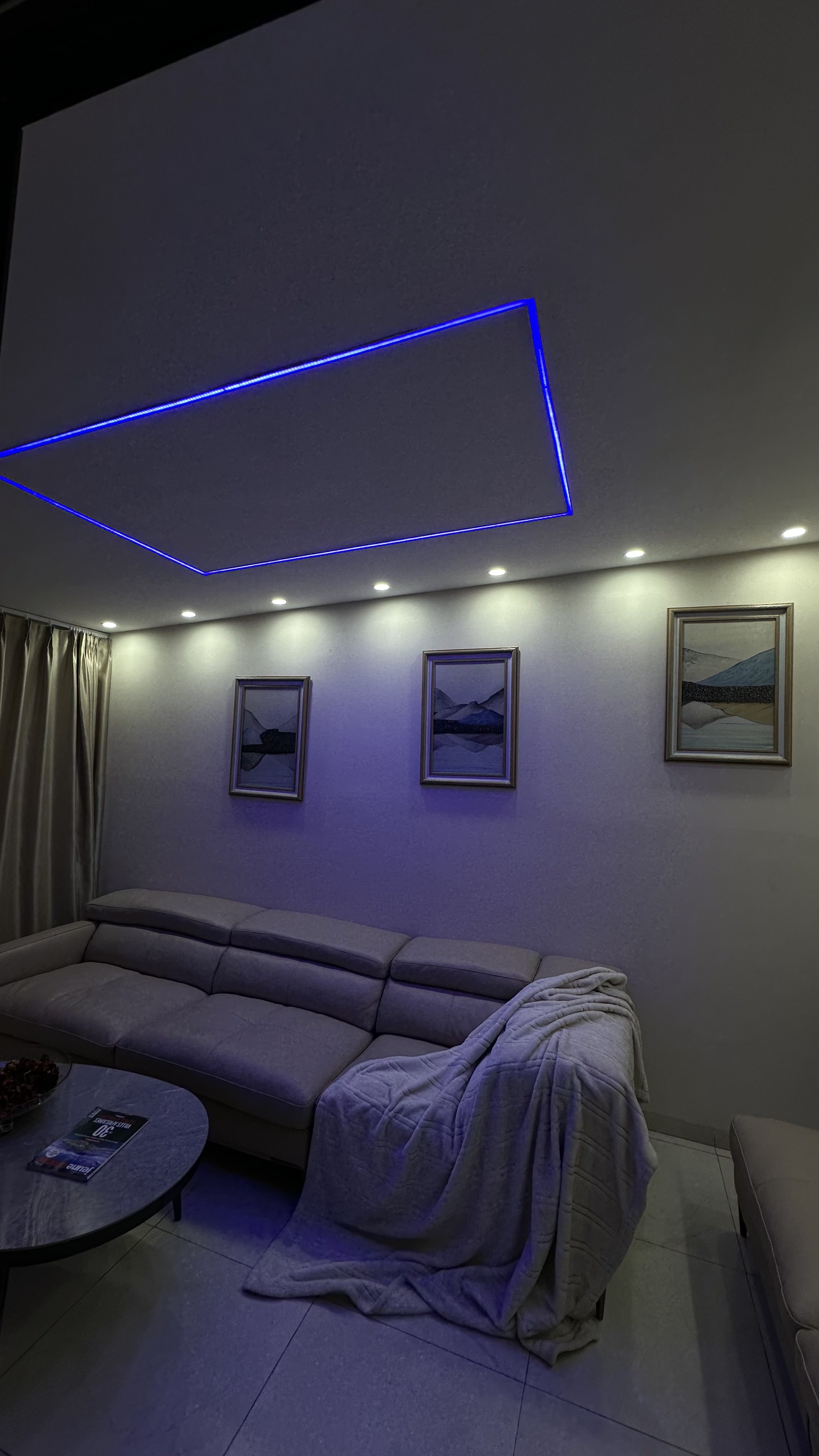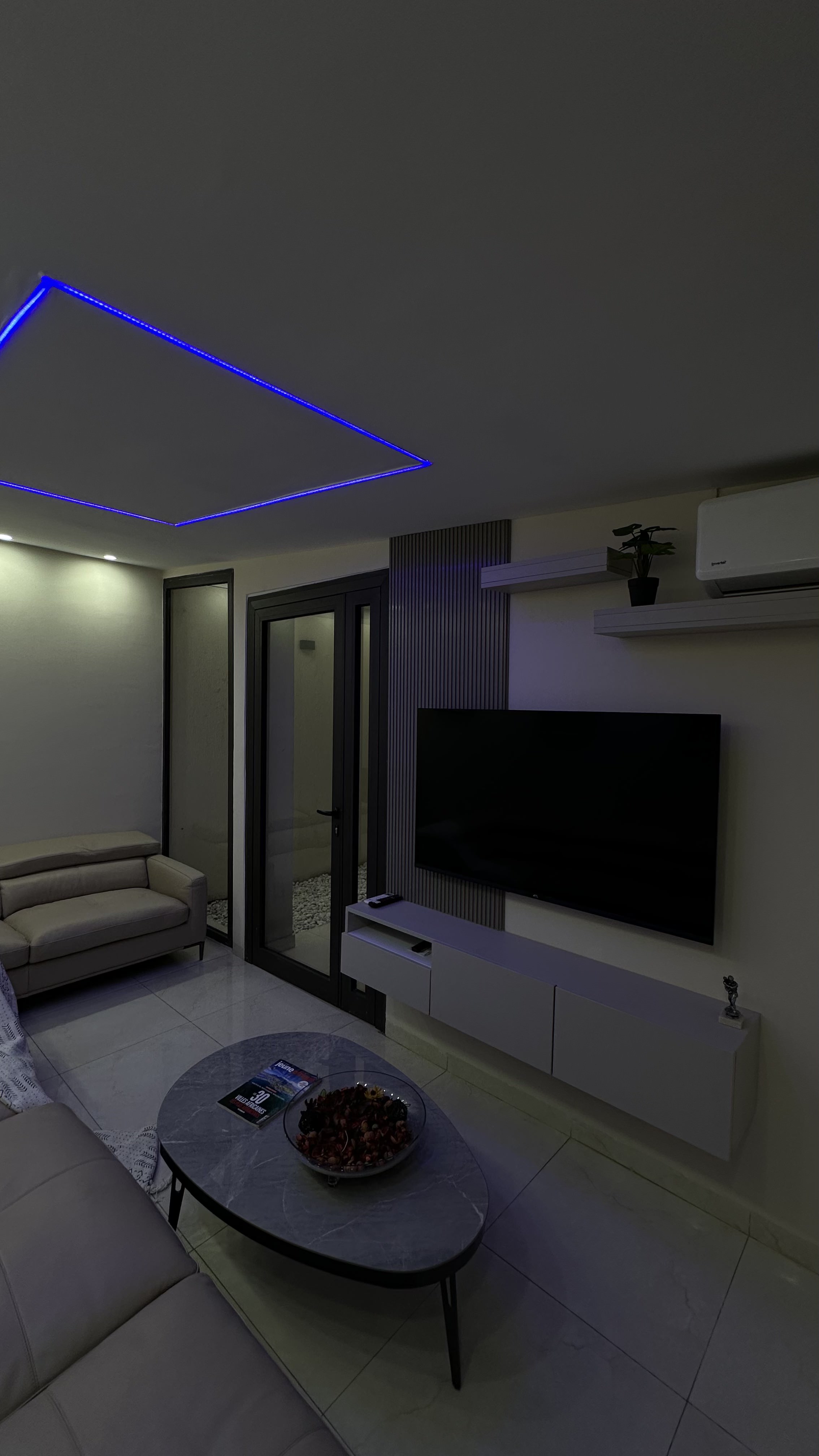Conversion d’une salle de sport en salon privé avec cloisonnement, baie vitrée, faux plafond en placoplâtre, remplacement du carrelage, électricité et peinture complète.